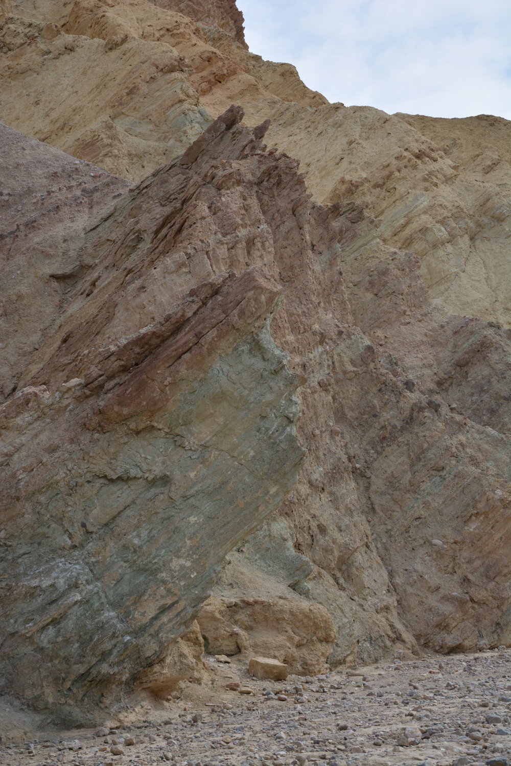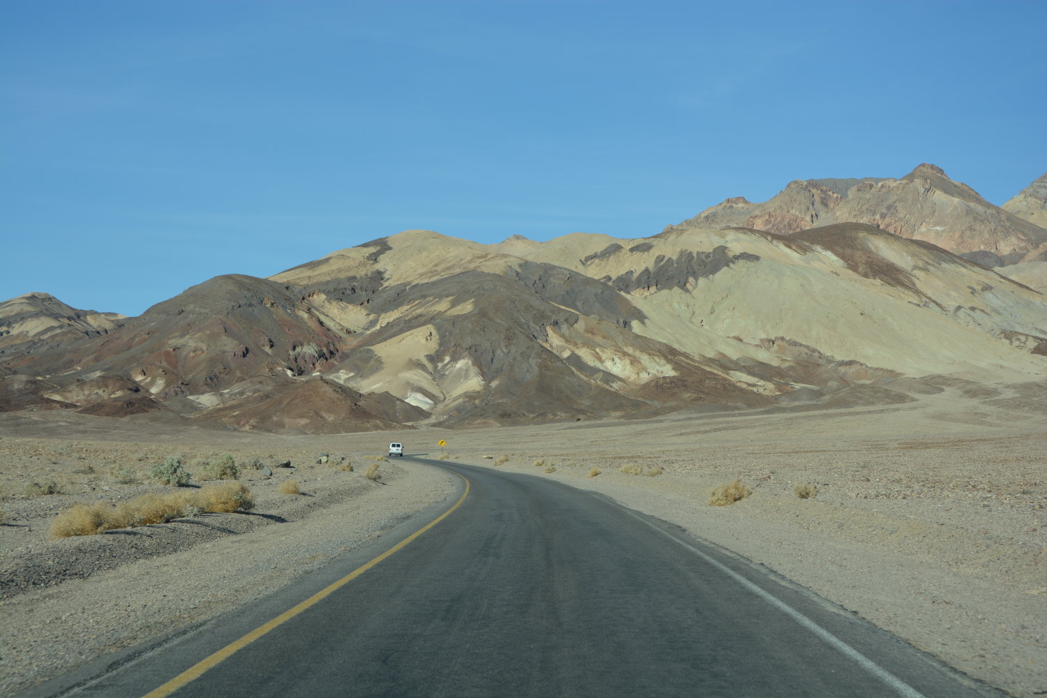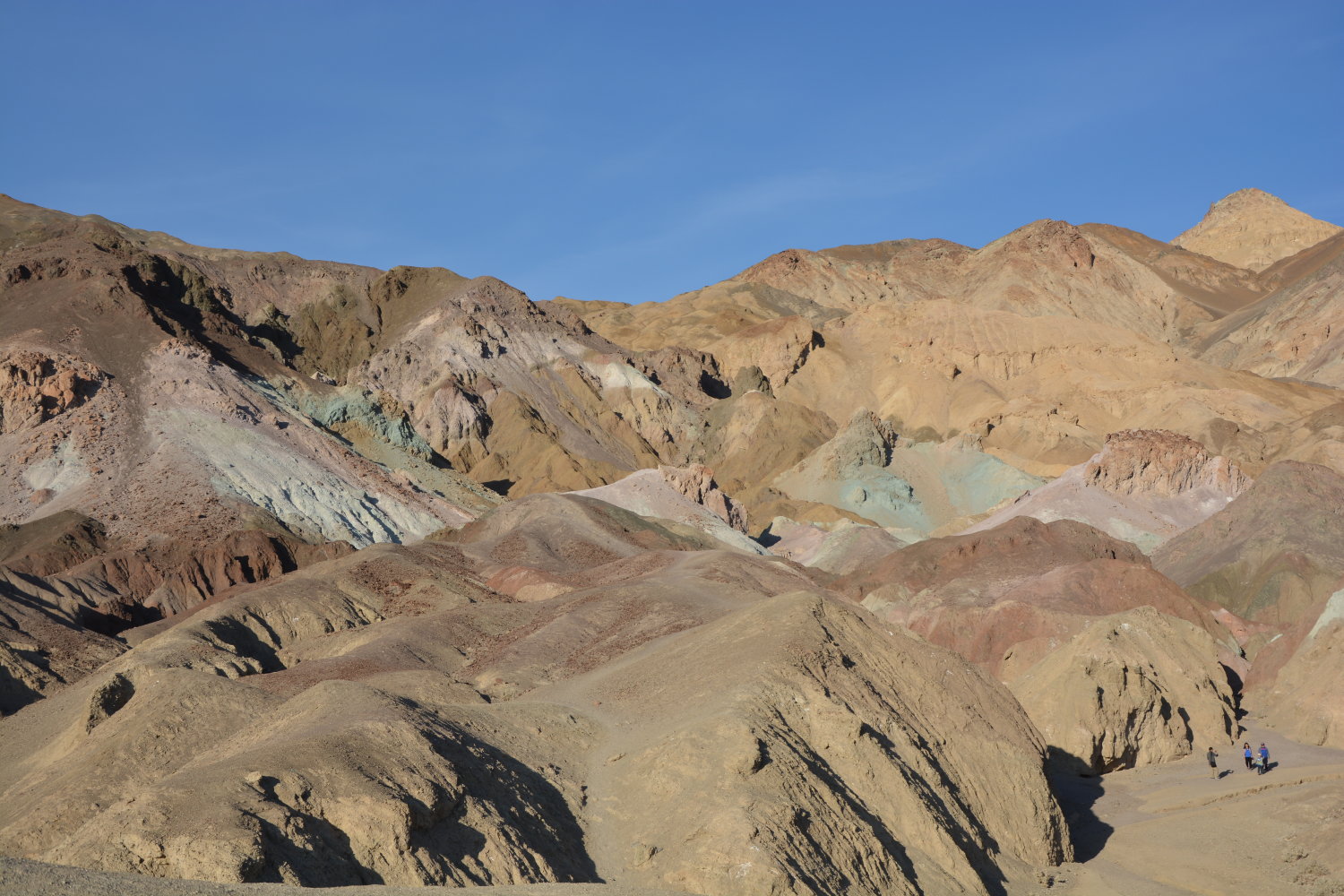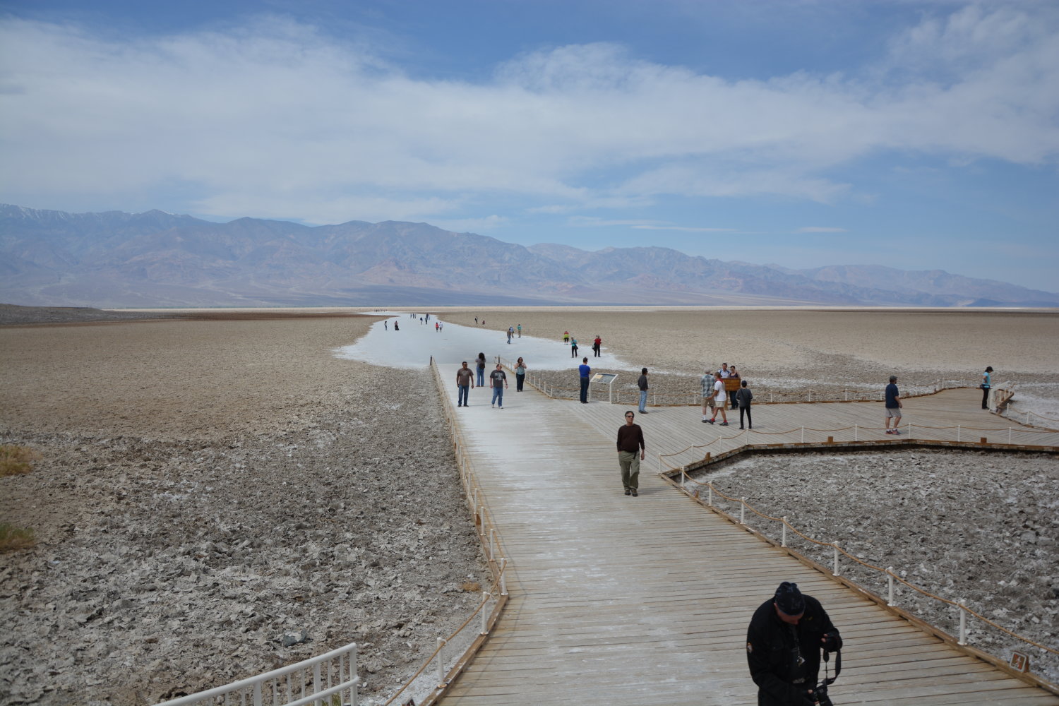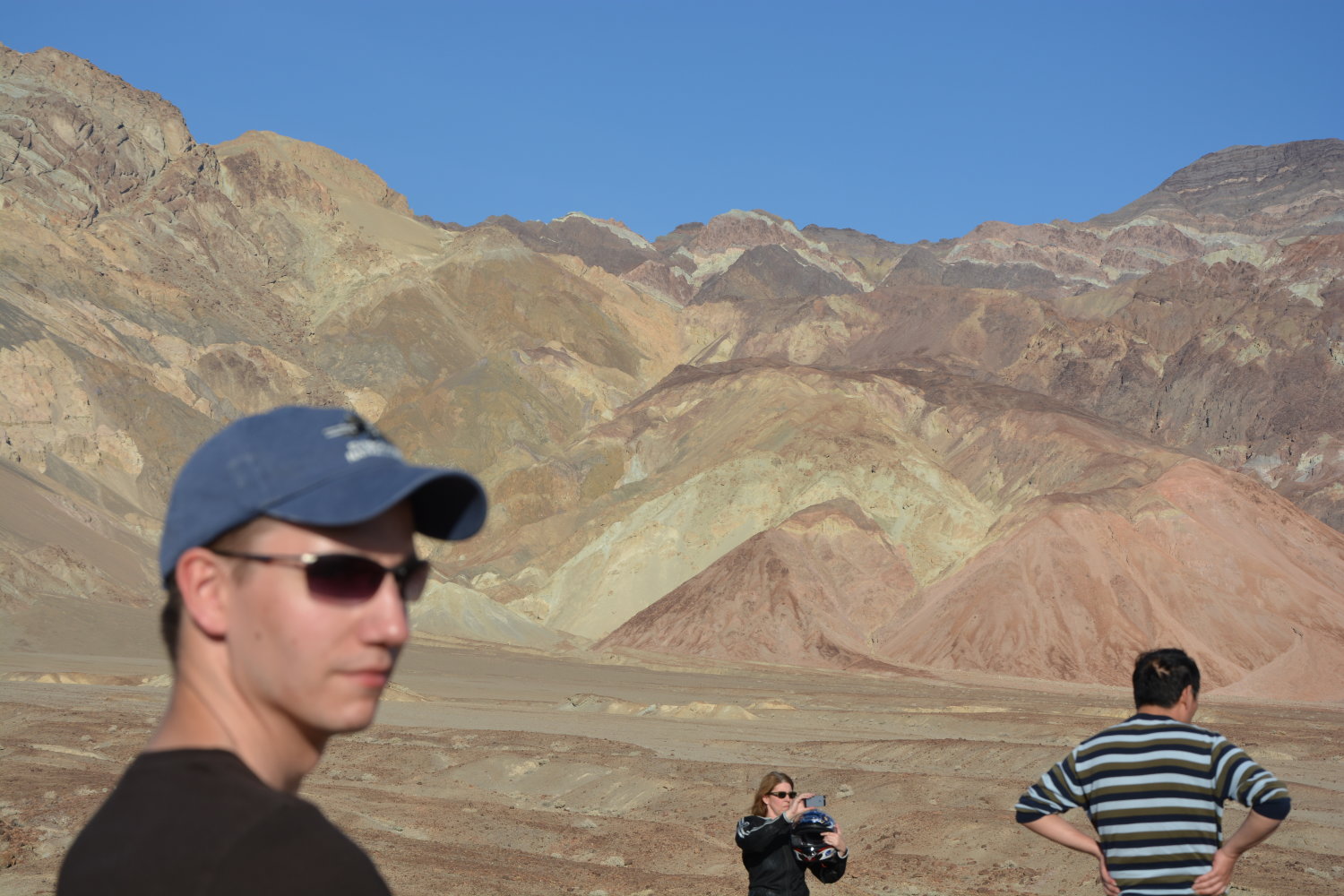 Nach unserem Aufenthalt in Las Vegas ging es weiter auf einen Abstecher ins “Death Valley”, dem heißesten Ort der Erde — zumindest prinzipiell. Da wir ja noch im Frühling herumreisen, waren es dort “nur” gemütliche 30°C im Schatten. In der Sonne natürlich mehr. Wir schwitzten uns also gut einen ab auf unseren Touren. Unter anderem waren wir an einem Salzsee und in einem Canyon, der von den seltenen, aber jährlichen und dann sehr starken Regengüssen ausgewaschen wurde — schon seit Millionen von Jahren. Und wir waren am “Badwater”, dem tiefsten Punkt von Nordamerika, 85 Meter unter dem Meeresspiegel. Durch diese Lage, eingebettet zwischen riesigen Gebirgen (der tiefste und der höchste Punkt der USA sind quasi in Sichtweite voneinander) ist es dort so heiß, dass hier vom Wasser ebenfalls nicht mehr übrig geblieben ist als eine riesige Salzwüste. Insgesamt war der Eindruck teilweise surreal: Die Berge wirkten meistens “organisch” und weich. Auch waren durch Mineralien die Gesteinsschichten teils nett eingefärbt: Grün und blau und gelb… Bei einer (abenteuerlichen) Autofahrt durch den “20-Mule-Team-Canyon” fühlten wir uns kurz in ein Dalí-Gemälde versetzt.