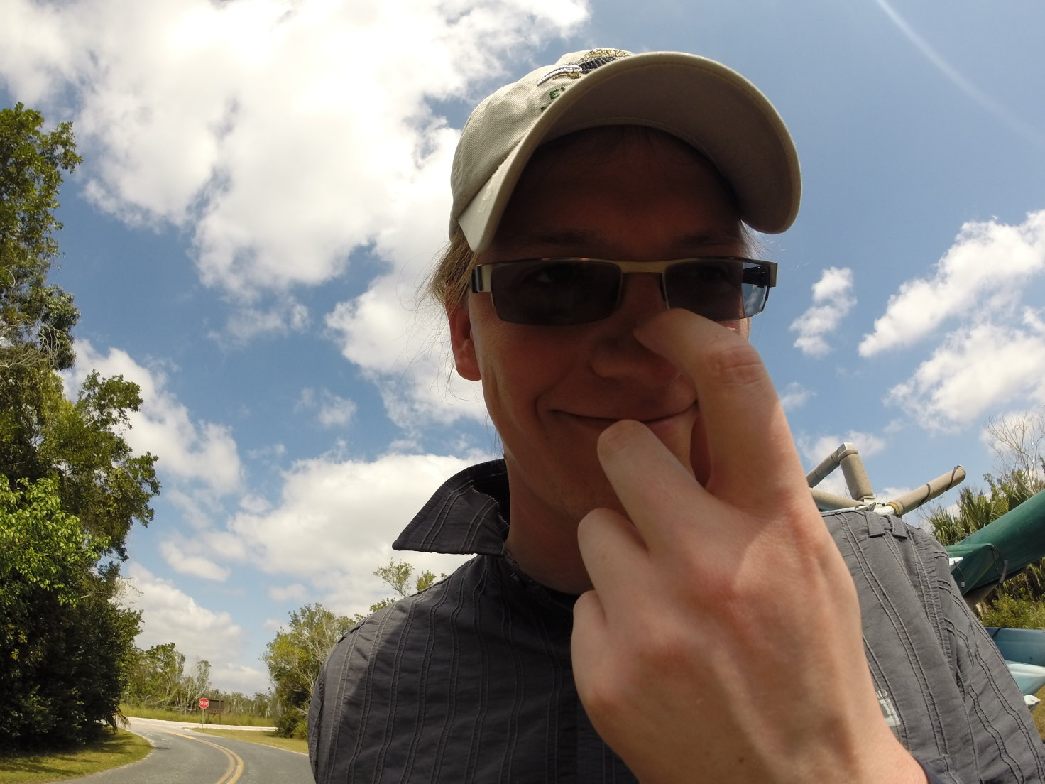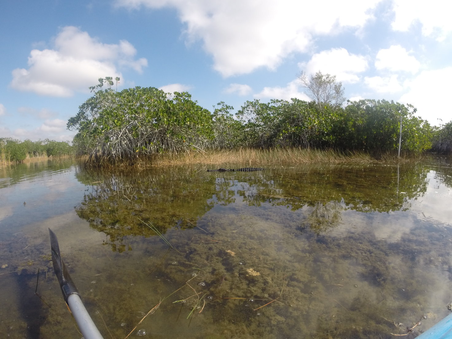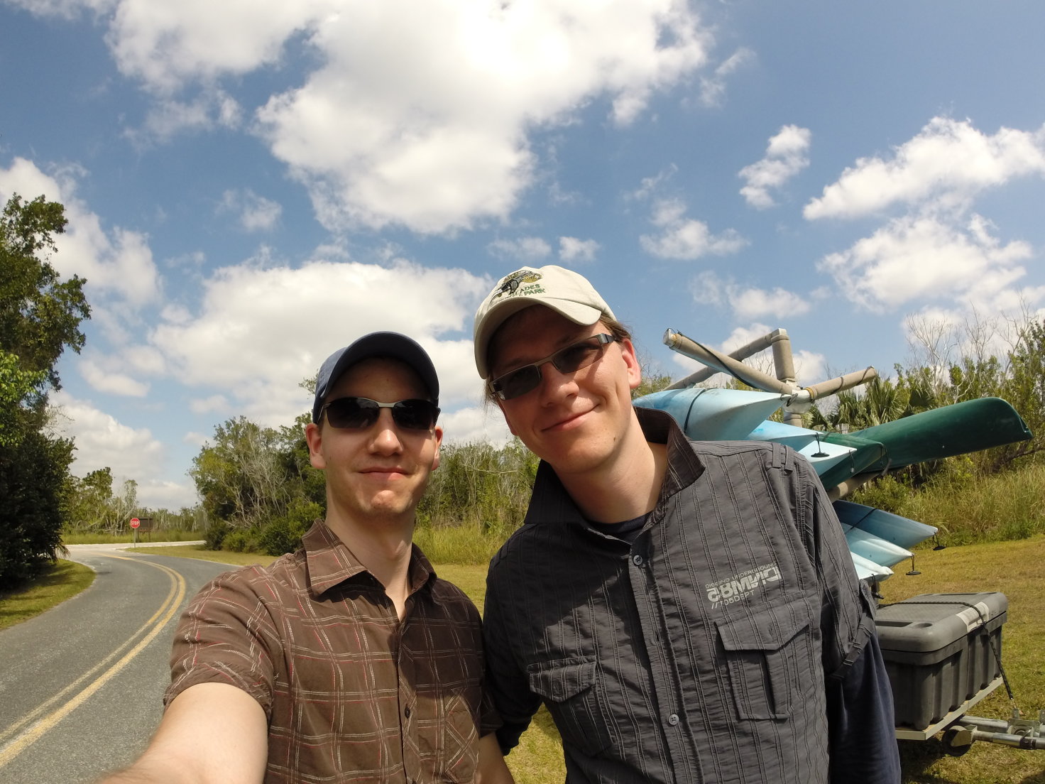 Aber wir hatten immer noch nicht genug, daher eine zweite Tour am nächsten Tag: Das Hostel organisiert halbtägige Kajaktouren durch die südlichen Everglades. Da diese morgens um 8 beginnen war das auch der Grund, dort zu übernachten :). Nach einer kurzen Fahrt mit dem Auto setzten wir in einem See ins Wasser ein und schipperten etwas über zwei Stunden durch die (bis auf ein wenig Grillenzirpen extrem stille) Landschaft. Dabei haben wir nochmal sicher 15 Alligatoren gesehen, von denen wir an manche (eher unabsichtlich) extrem nah vorbeikamen – über einen ist André direkt mit seinem Kajak hinweggeglitten, der andere war in einem etwas engeren Wasserlauf irgendwo unter Wasser. Man sah ihn nicht, aber unsere Führerin meinte, es sei besser, jetzt gerade nicht die Paddel zu benutzen, sondern sich still an den Bäumen entlang über ihn hinwegzuziehen… Spannend und unheimlich zugleich. Überhaupt war unser Guide, eine Deutsche, sehr gut informiert, konnte alle Fragen beantworten und war sehr engagiert bei der Sache (nach eigener Aussage dankte sie uns, dass sie wegen uns einen Grund hatte, aufs Wasser zu fahren). Alles in allem eine gute Investition. ![]()