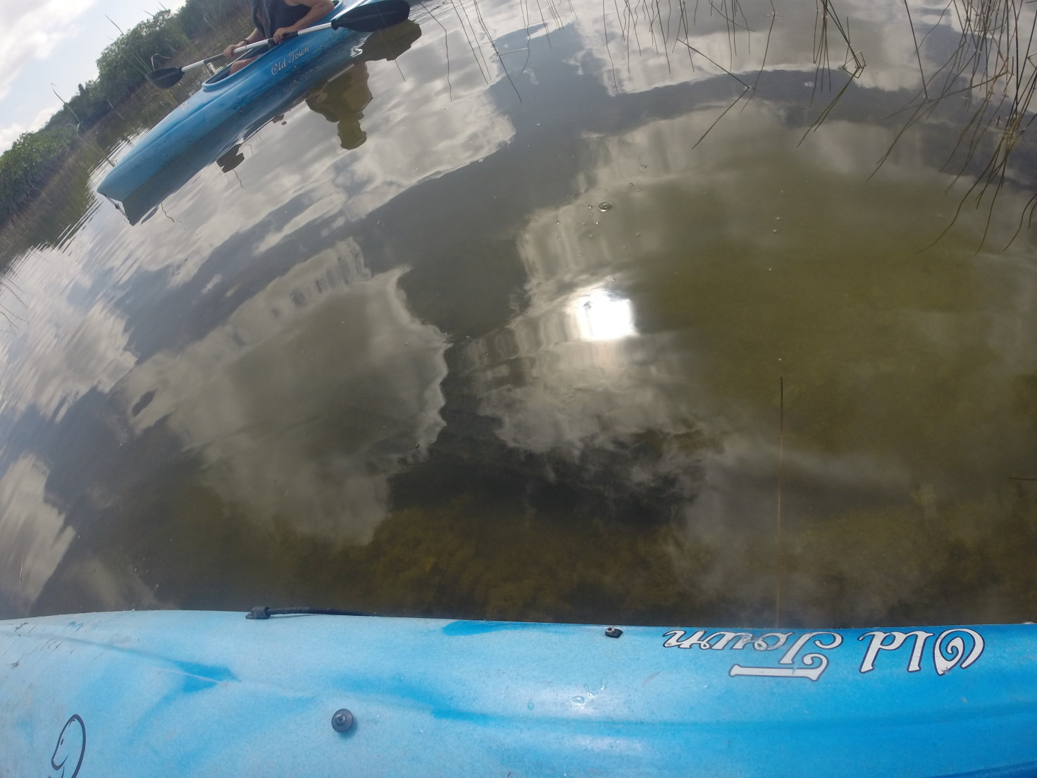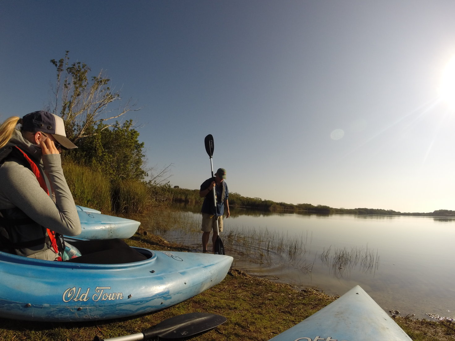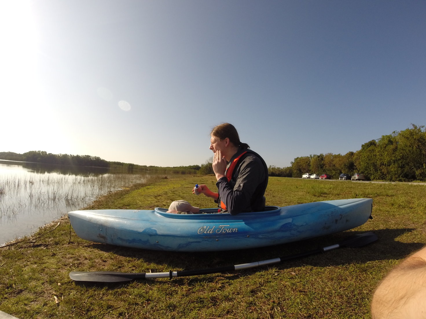 Aber wir hatten immer noch nicht genug, daher eine zweite Tour am nächsten Tag: Das Hostel organisiert halbtägige Kajaktouren durch die südlichen Everglades. Da diese morgens um 8 beginnen war das auch der Grund, dort zu übernachten :). Nach einer kurzen Fahrt mit dem Auto setzten wir in einem See ins Wasser ein und schipperten etwas über zwei Stunden durch die (bis auf ein wenig Grillenzirpen extrem stille) Landschaft. Dabei haben wir nochmal sicher 15 Alligatoren gesehen, von denen wir an manche (eher unabsichtlich) extrem nah vorbeikamen – über einen ist André direkt mit seinem Kajak hinweggeglitten, der andere war in einem etwas engeren Wasserlauf irgendwo unter Wasser. Man sah ihn nicht, aber unsere Führerin meinte, es sei besser, jetzt gerade nicht die Paddel zu benutzen, sondern sich still an den Bäumen entlang über ihn hinwegzuziehen… Spannend und unheimlich zugleich. Überhaupt war unser Guide, eine Deutsche, sehr gut informiert, konnte alle Fragen beantworten und war sehr engagiert bei der Sache (nach eigener Aussage dankte sie uns, dass sie wegen uns einen Grund hatte, aufs Wasser zu fahren). Alles in allem eine gute Investition. ![]()
