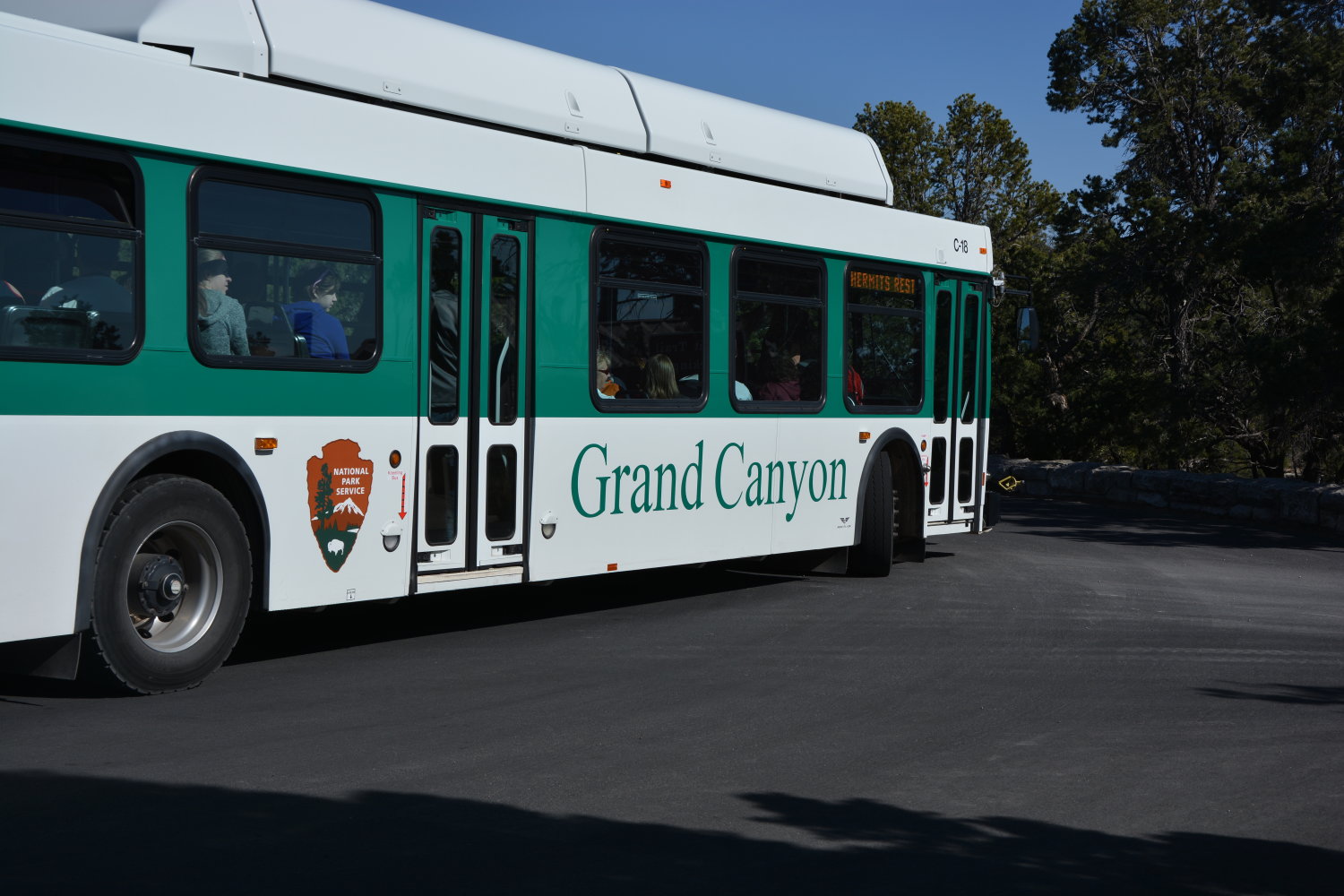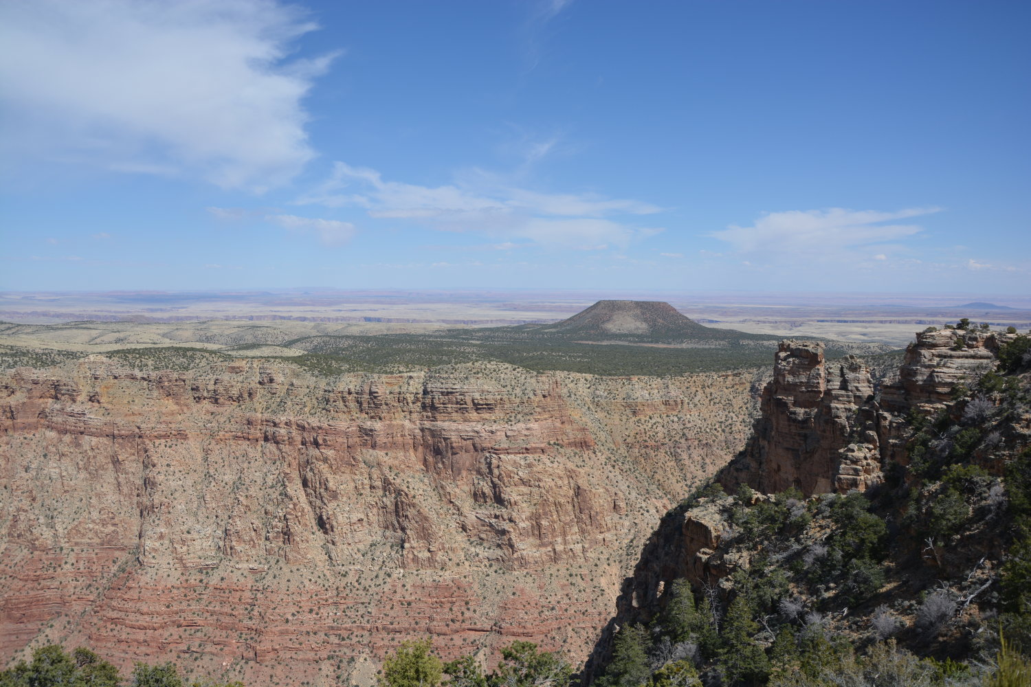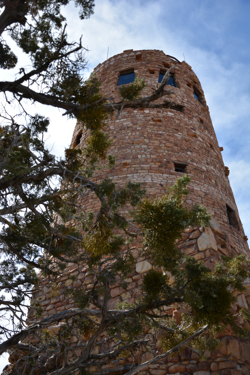 Wenn man im Grand Canyon ist, gibt es in der Regel zwei Möglichkeiten, die Umgebung zu erkunden: Entweder man bleibt oberhalb der Kante und wandert diese entlang, oder man steigt die Kante entlang auf gewundenen Pfaden nach unten hinab — muss dann aber irgendwann natürlich umkehren und wieder hinaufsteigen (anstrengend!). Nach unserer ersten (kalten) Übernachtung und der vorher gebuchten Muli-Tour (zu der kommen wir gleich noch) sind wir also zunächst an der Kante (dem “Rim”) entlang gewandert. Dazu hält die kleine und sehr gute Grand-Canyon-Zeitung, die man gratis bei der Einfahrt in den Nationalpark erhält, einige Tourvorschläge in verschiedenen Schwierigkeitsstufen bereit. Wir sind also etwa 5 Kilometer gewandert, dankbarerweise auf asphaltierten Straßen ohne größere Steigungen, und haben dabei viel Fauna, Flora und natürlich Canyon-Ausblick gesehen. In einem Wort: Gigantisch. Das Ding ist unvorstellar groß, und auf Bildern gar nicht einzufangen. Nicht ohne ein gewaltiges Weitwinkelobjektiv. Ganz unten konnte man immer mal wieder den Colorado-River erblicken, der sich durch das Tal schlängelt.