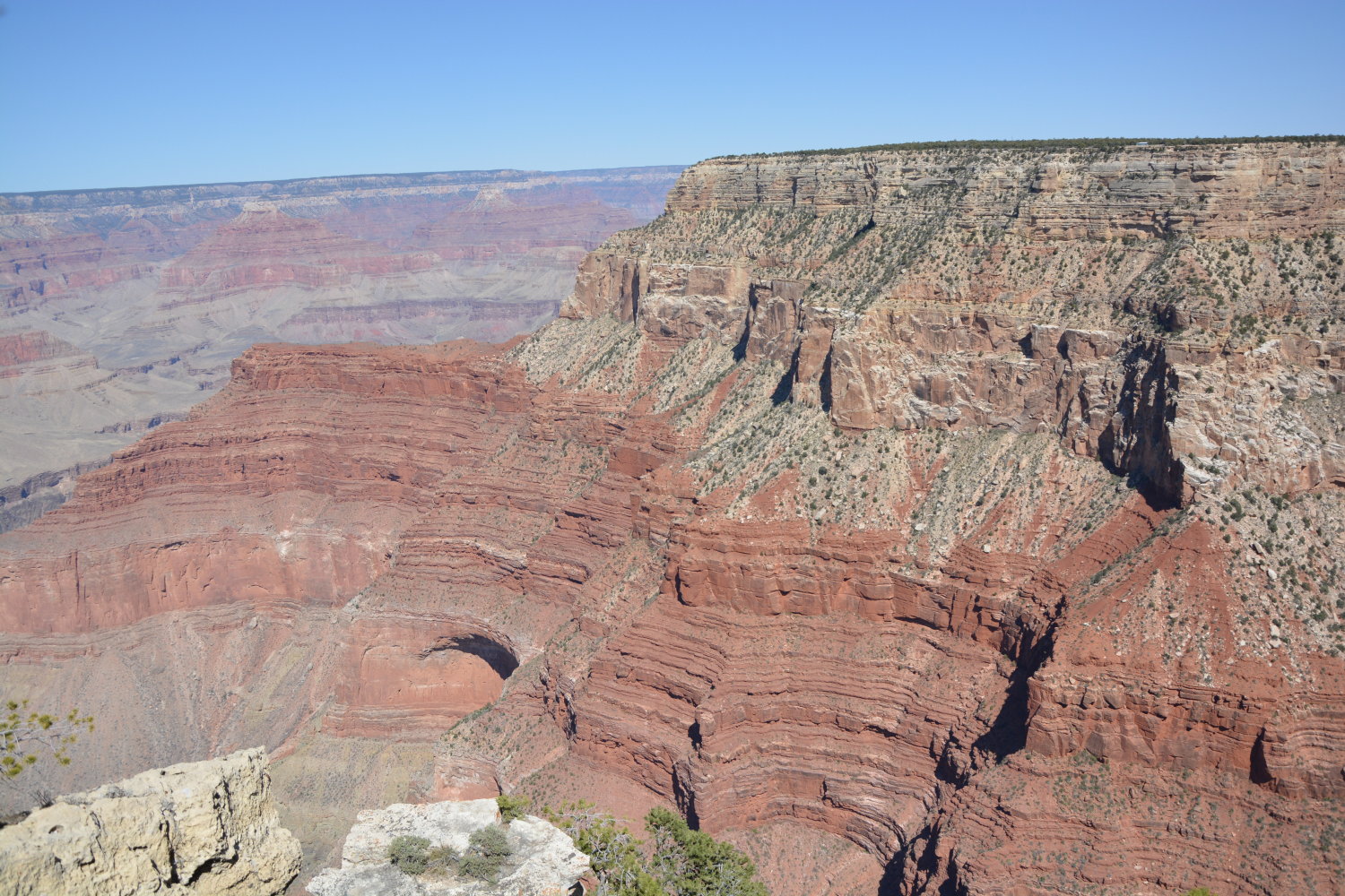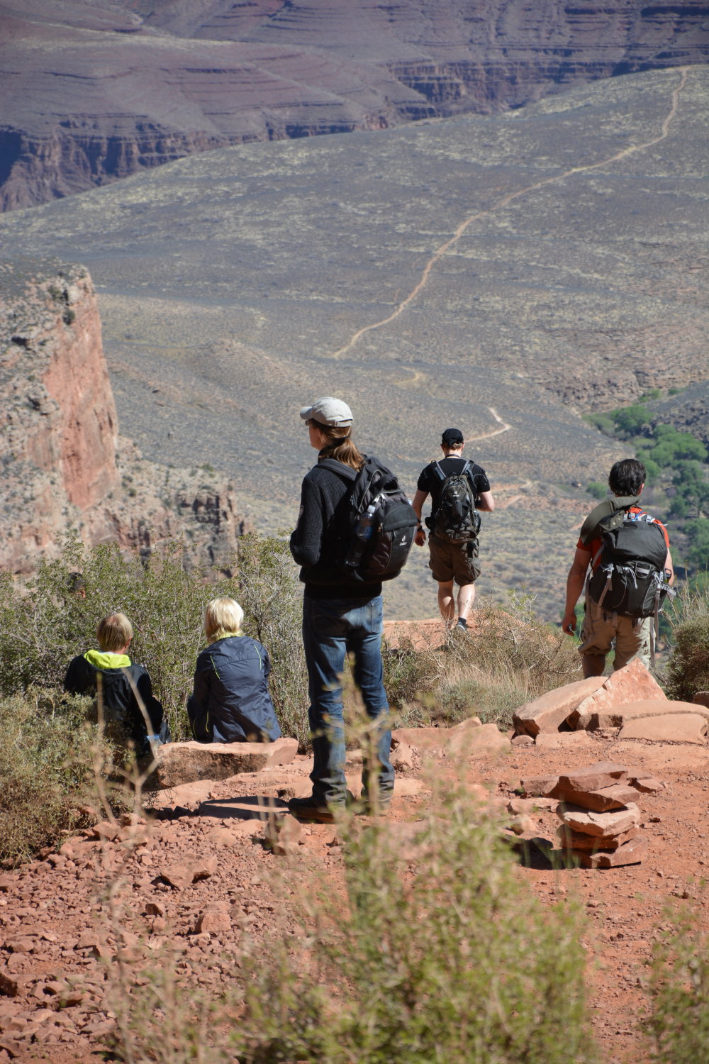 Das war also der erste Tag. Eine weitere kalte Nacht folgte (am Grand Canyon geht es auch zu dieser Jahreszeit schon mal auf -6°C runter, obwohl drumherum deutlich höhere Temperaturen herrschen; man darf nicht vergessen, dass das Village auf rund 2.2km Höhe liegt) und dann machten wir uns auf, ein wenig in den Grand Canyon hinunterźusteigen. Auch dort gibt es verschiedene Touren in verschiedenen “Schwierigkeitsgraden” — wir entschieden uns für eine mittlere mit einer Rundlaufzeit (also runter und gleicher Weg wieder rauf) von 2-4 Stunden. Nach etwa einer Stunde waren wir 2,4 km gelaufen und dabei ca. 300 Meter tiefer in den Canyon abgestiegen. Hier waren die Wege schon deutlich … riskanter: Oft lief man tatsächlich nur 30cm von der Kante entfernt auf unbefestigten schmalen Pfaden, während einem womöglich noch andere Wanderer entgegen kamen. Aber wir haben es überlebt.