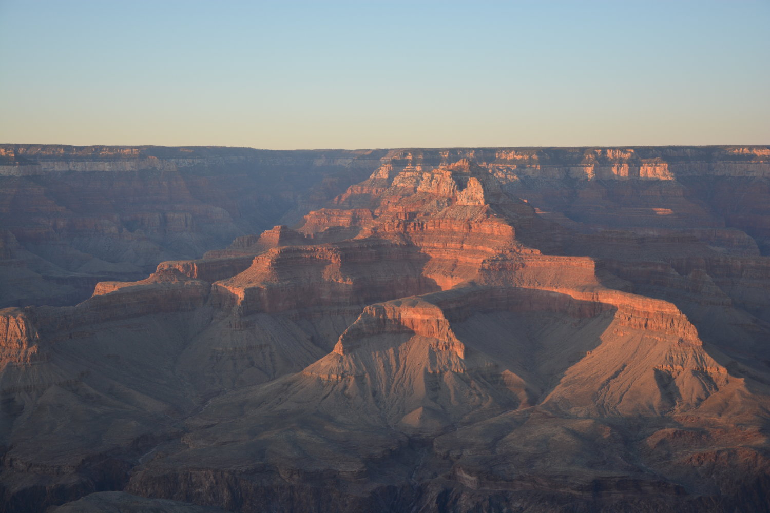 Der Grand Canyon ist im wesentlichen genau das, was der Name sagt: Eine riesige Schlucht, die sich etwa 277 Meilen (446 km) von Westen nach Osten erstreckt und bis zu 18 Meilen (28 km) von einer Kante zur anderen breit und 1 Meile (knapp 2 km) tief ist. Das ergibt natürlich eine atemberaubende Aussicht: Unsere Unterkunft im “Grand Canyon Village” war nur ca. 20 Meter von der Schluchtkante entfernt, so dass wir bereits am Abend unserer Ankunft unseren ersten “Wow!”-Effekt erleben durften.