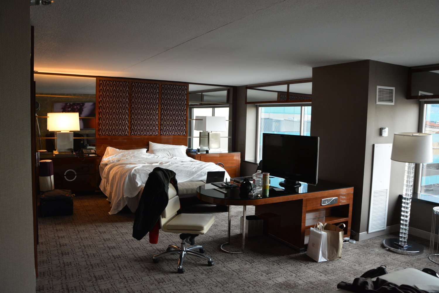 Am frühen Nachmittag kamen wir in Las Vegas (und auf dessen überfüllten Straßen an). Schon auf der Fahrt zu unserem Hotel konnten wir einige der großen Hotels am Strip sehen, doch auch wir hatten uns zwei Nächte in einem der großen Namen gegönnt: Eine King Suite im MGM Grand (das mit dem Löwen). Beim Check-In gab es dann direkt noch eine Warteschlange, aber das Zimmer war das Warten auch wert: Ein echter “Wow”-Effekt, wenn man reinkam. So groß wie eine kleine Wohnung (ca. 60 m²) mit riesigem Bett und abgetrenntem “Wohnbereich”, das Bad auch genial mit zwei Waschbecken, Badewanne UND Dusche. Grandios. Schade im Nachhinein, dass wir nicht viel auf dem Zimmer waren.